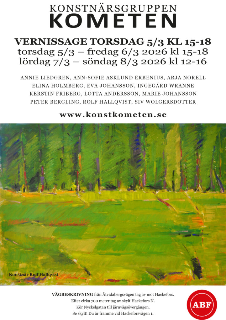 5 – 8/3 grupputställning Konstnärsgruppen Kometen i ateljén Hackefors. Vernissage 5/3 kl. 15 – 18. Besöksadress: Kometens ateljé, Hackeforsvägen 1, 2 tr. Linköping (finns hiss).